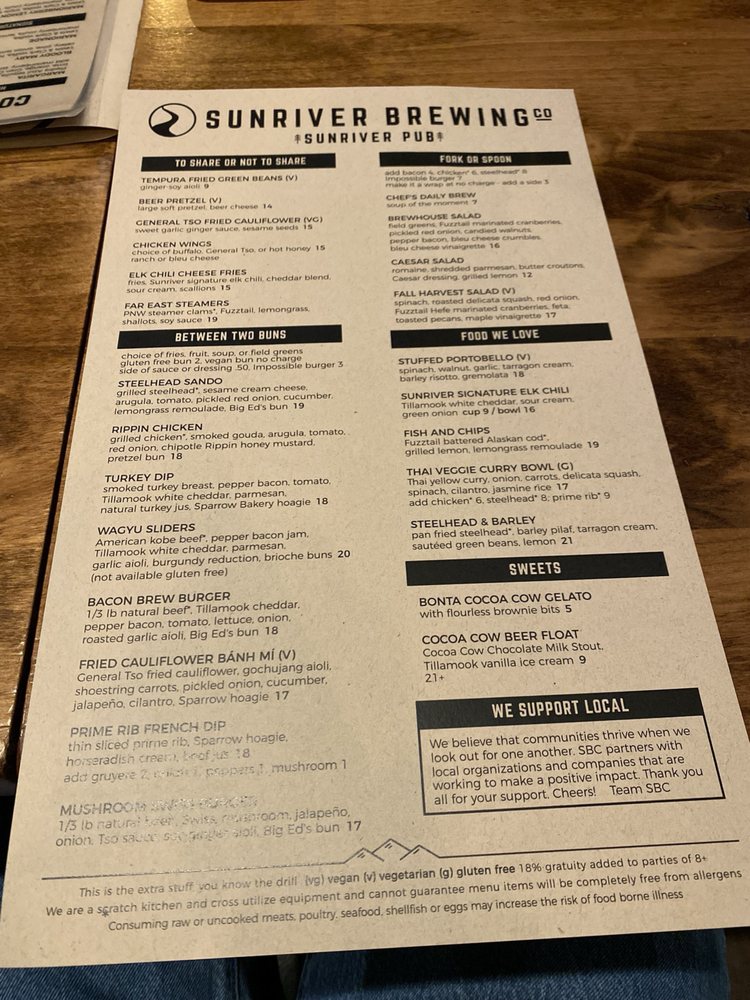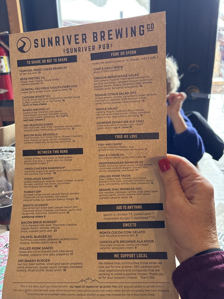 Sunriver Brewing Co - Sunriver Pub in Sunriver, OR offers a diverse menu with a focus on delicious chicken wings. The restaurant provides a variety of options for all dietary preferences, including vegan and vegetarian choices. With amenities like takeout, delivery, outdoor seating, and a full bar, it is suitable for various occasions such as lunch, dinner, or happy hour. The establishment is also wheelchair accessible, and the welcoming atmosphere makes it ideal for groups, families, or individuals. The commitment to sustainability is evident through its use of compostable containers and plastic-free packaging. Overall, Sunriver Brewing Co - Sunriver Pub provides a comfortable and enjoyable dining experience with a diverse menu and excellent service.